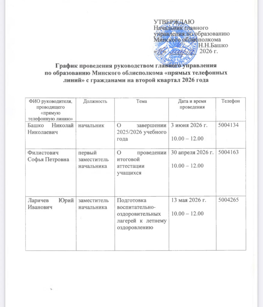 График проведения руководством главного управления по образованию Минского облисполкома «прямых телефонных линий» с гражданами на второй квартал 2026 года